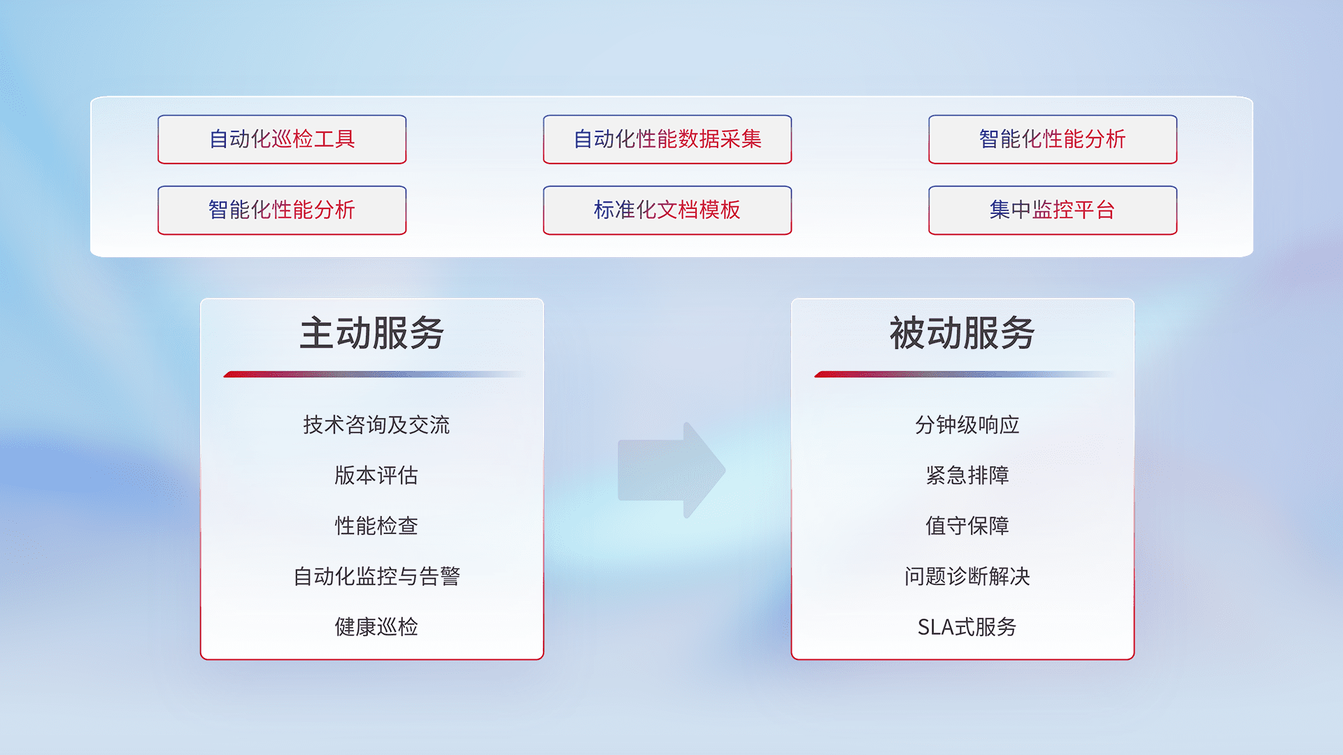 智能化工具和标准化文档,,,保障服务质量,,,,提供主动服务(包含技术咨询、、版本评估、、性能检查、、、、自动化监控与告警、、、健康巡检)和被动服务包含(分钟级响应、、、紧急排障、、、值守保障、、问题诊断解决、、、SLA服务)。。。